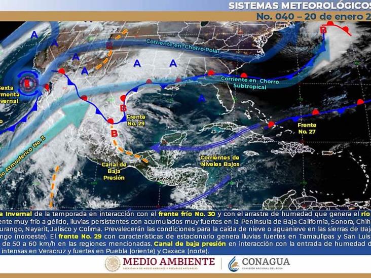 Esta noche y la madrugada del jueves, la sexta tormenta invernal de la temporada, en interacción con el frente frío No. 30, aunado al arrastre de humedad que genera el río atmosférico No. 3, mantendrán ambiente de muy frío a gélido, lluvias persistentes con acumulados muy fuertes en la Península de Baja California, Sonora, Chihuahua y Sinaloa, así como fuertes en Durango, Nayarit, Jalisco y Colima.