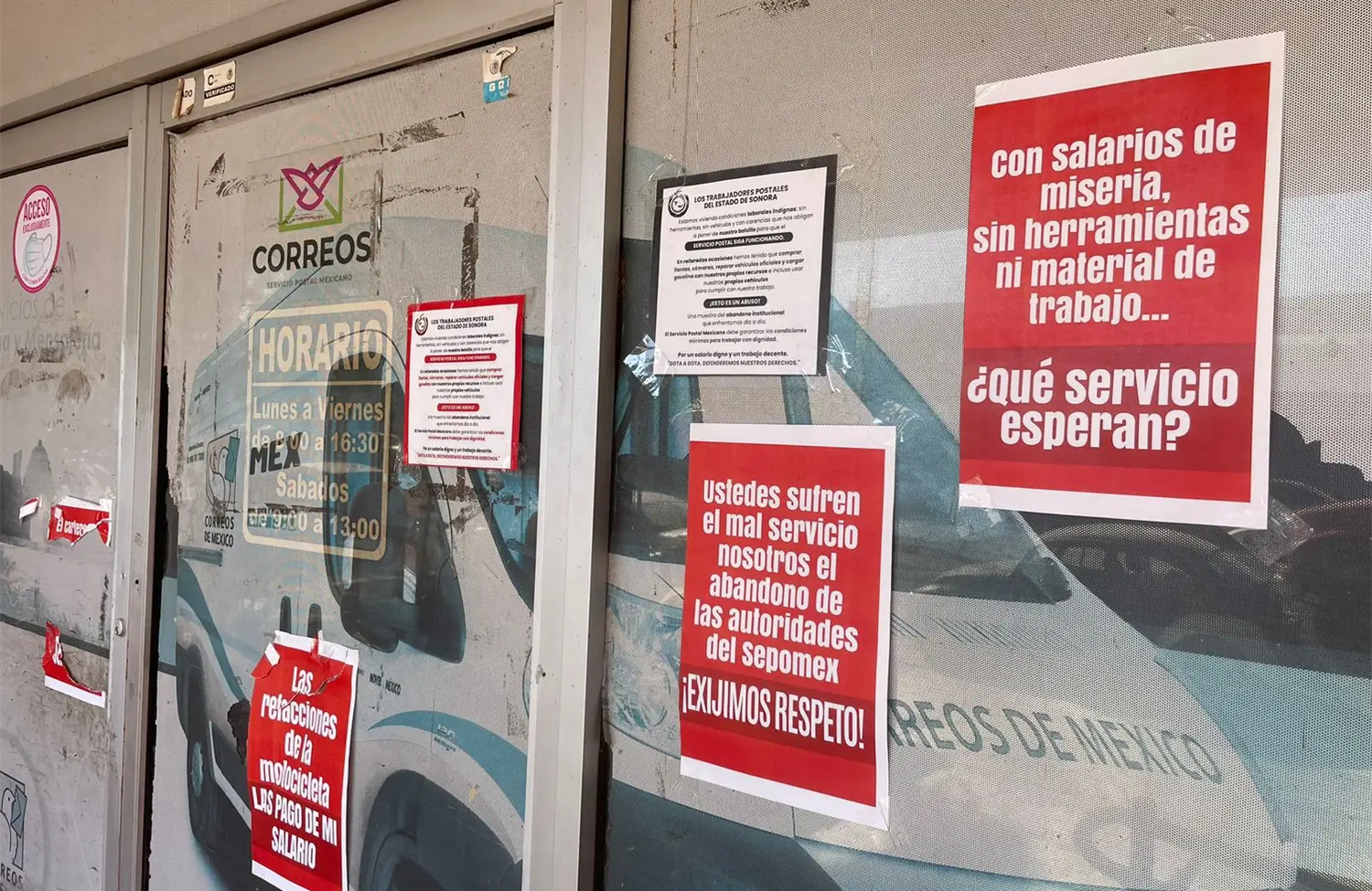 Empleados de Correos de México en Cajeme manifestaron su inconformidad en el marco del Día del Cartero con pancartas instaladas por fuera de las oficinas en las que exigen una respuesta a sus peticiones de aumentos salariales, condiciones dignas de trabajo y refacciones para motos y bicicletas.