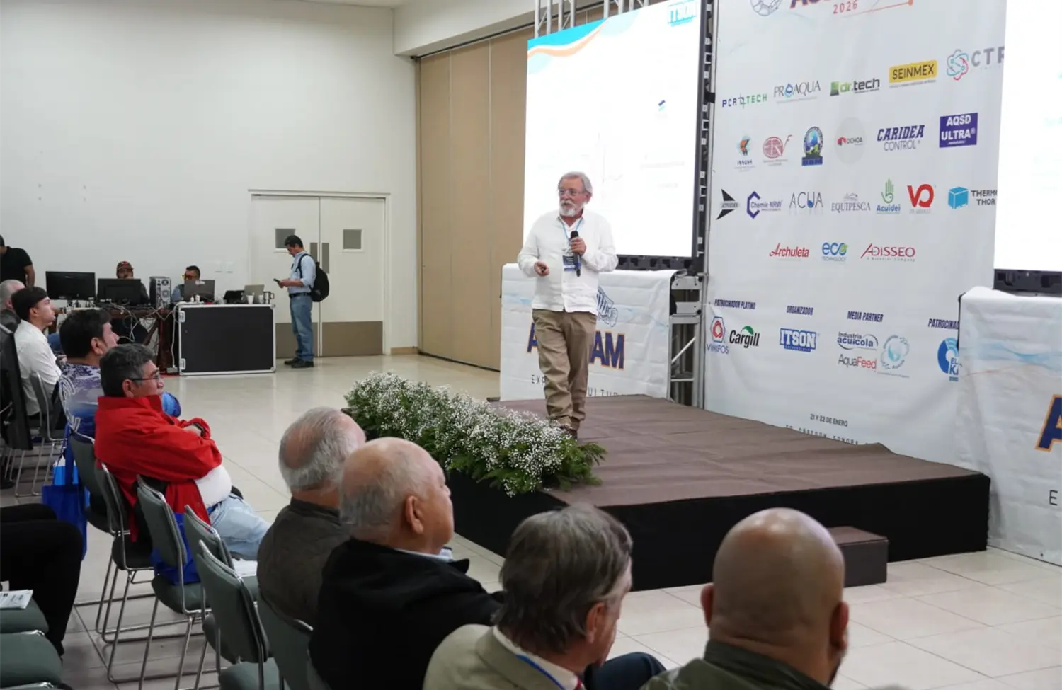 En el marco de su ponencia, explicó que su presentación fue el producto de la colaboración histórica en el periodo de 1973 a 2025 entre autoridades sanitarias, productores y la academia, quienes trabajaron en la producción de camarón frente a patógenos como el que ingresó a la región en 1987 provenientes del Indo Pacífico.