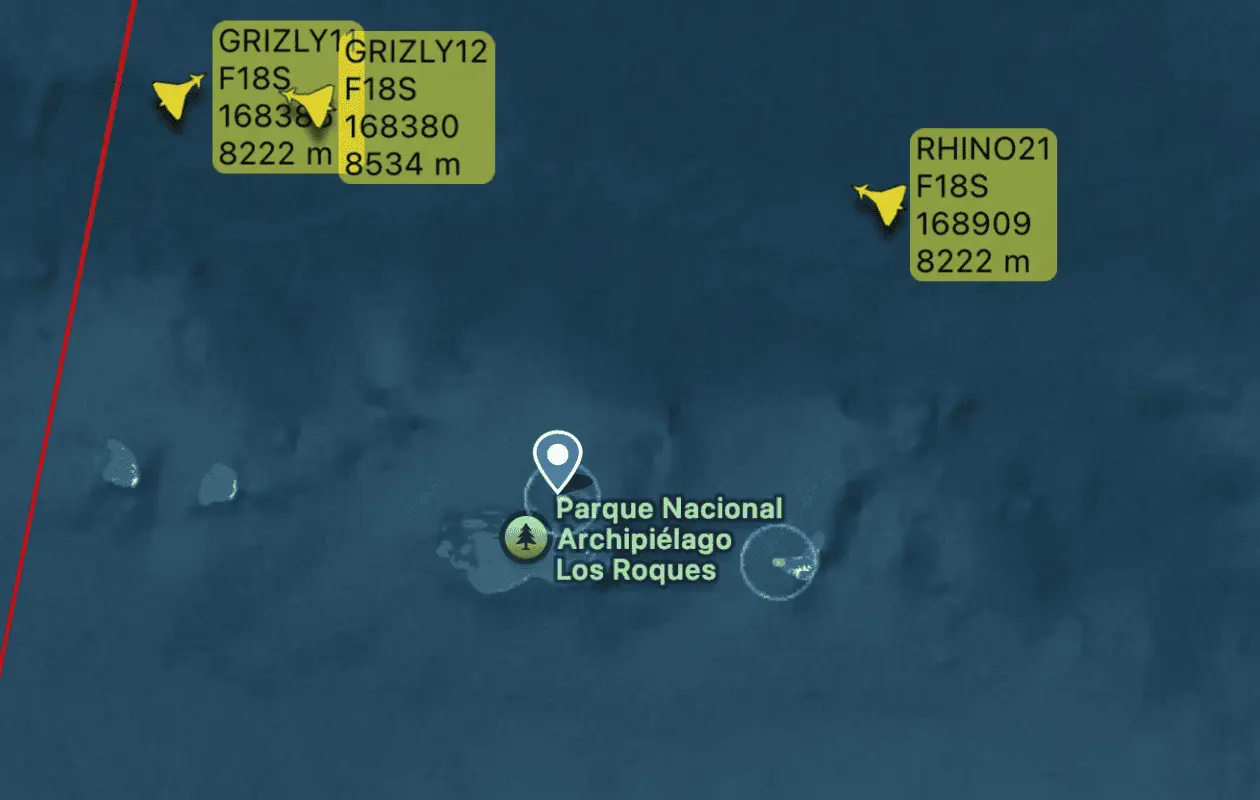 Según datos del sistema de seguimiento Flight Radar, el despliegue incluyó dos aeronaves Boeing EA-18G Growler y tres Boeing F/A-18E Super Hornet, como parte de la presencia militar estadounidense en el Caribe.