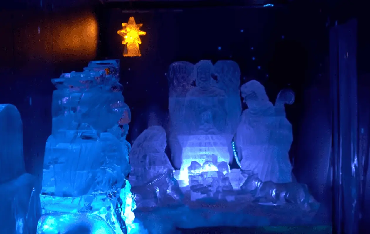 En su interior, a una temperatura aproximada de -12 °C, los visitantes pueden contemplar las figuras de la Sagrada Familia, los Reyes Magos con sus ofrendas, un ángel y otras representaciones religiosas. La elaboración de esta obra artística tomó cerca de un mes.
