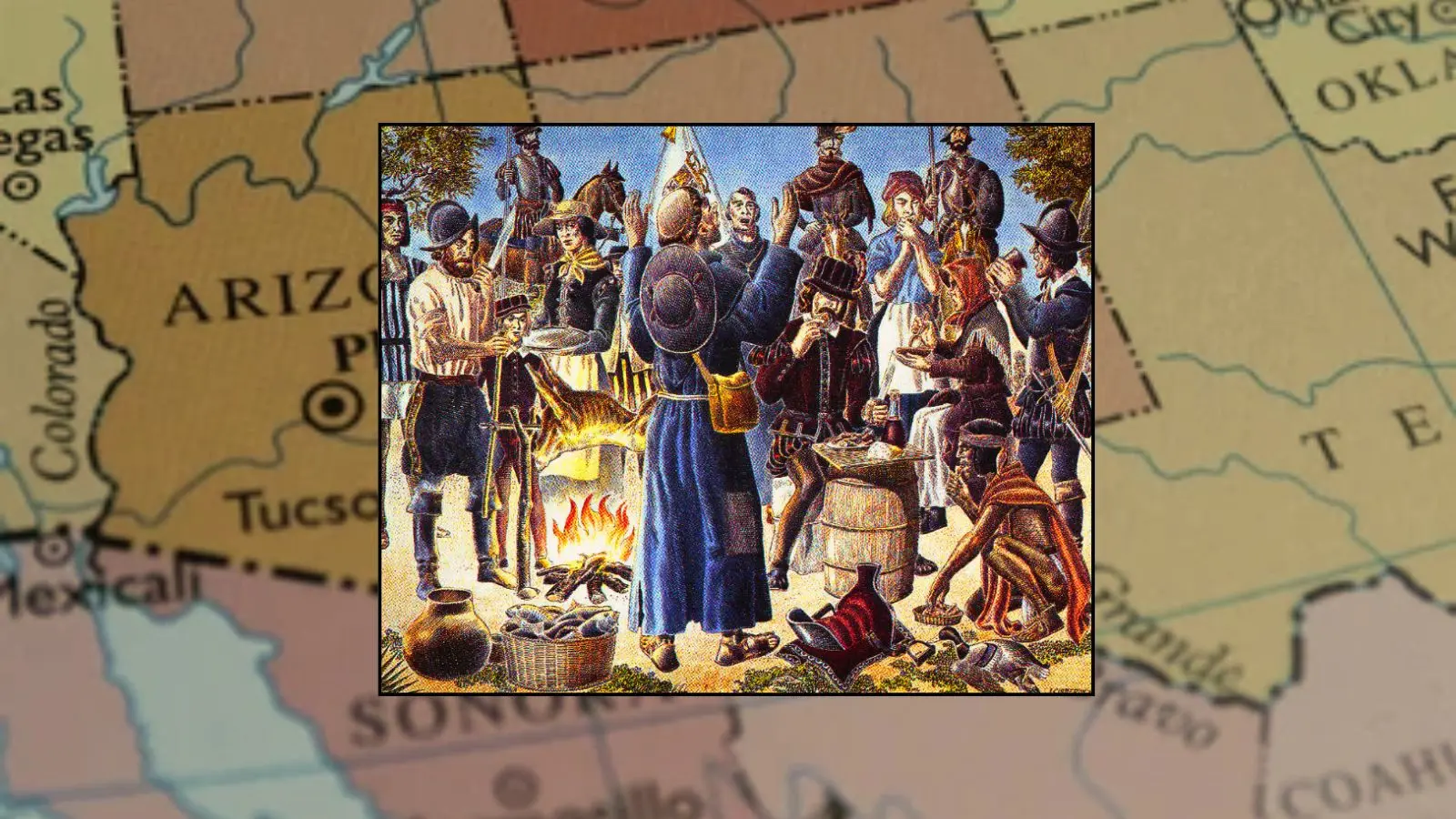 Sin embargo, la historia real es más amplia y sorprendente: décadas antes de ese famoso banquete, ya había ocurrido una celebración de agradecimiento en territorio que entonces pertenecía a España y que hoy abarca parte de México y Estados Unidos.
