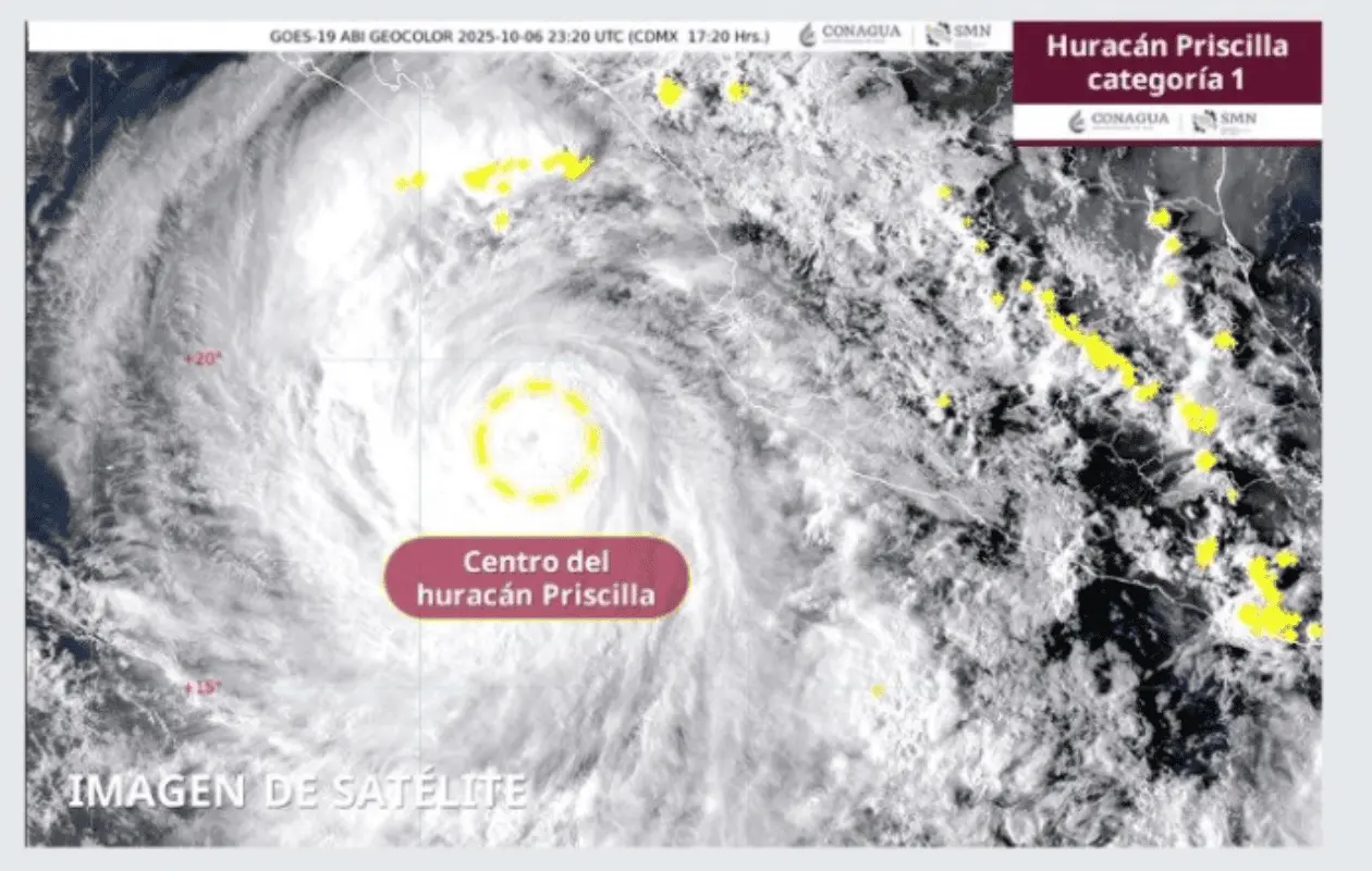 El huracán Priscilla, de categoría 1 en la escala Saffir-Simpson, continúa su avance por el Pacífico mexicano y ocasionará lluvias torrenciales y alto oleaje en al menos siete estados del país, advirtió el Servicio Meteorológico Nacional (SMN), organismo de la Comisión Nacional del Agua (Conagua).