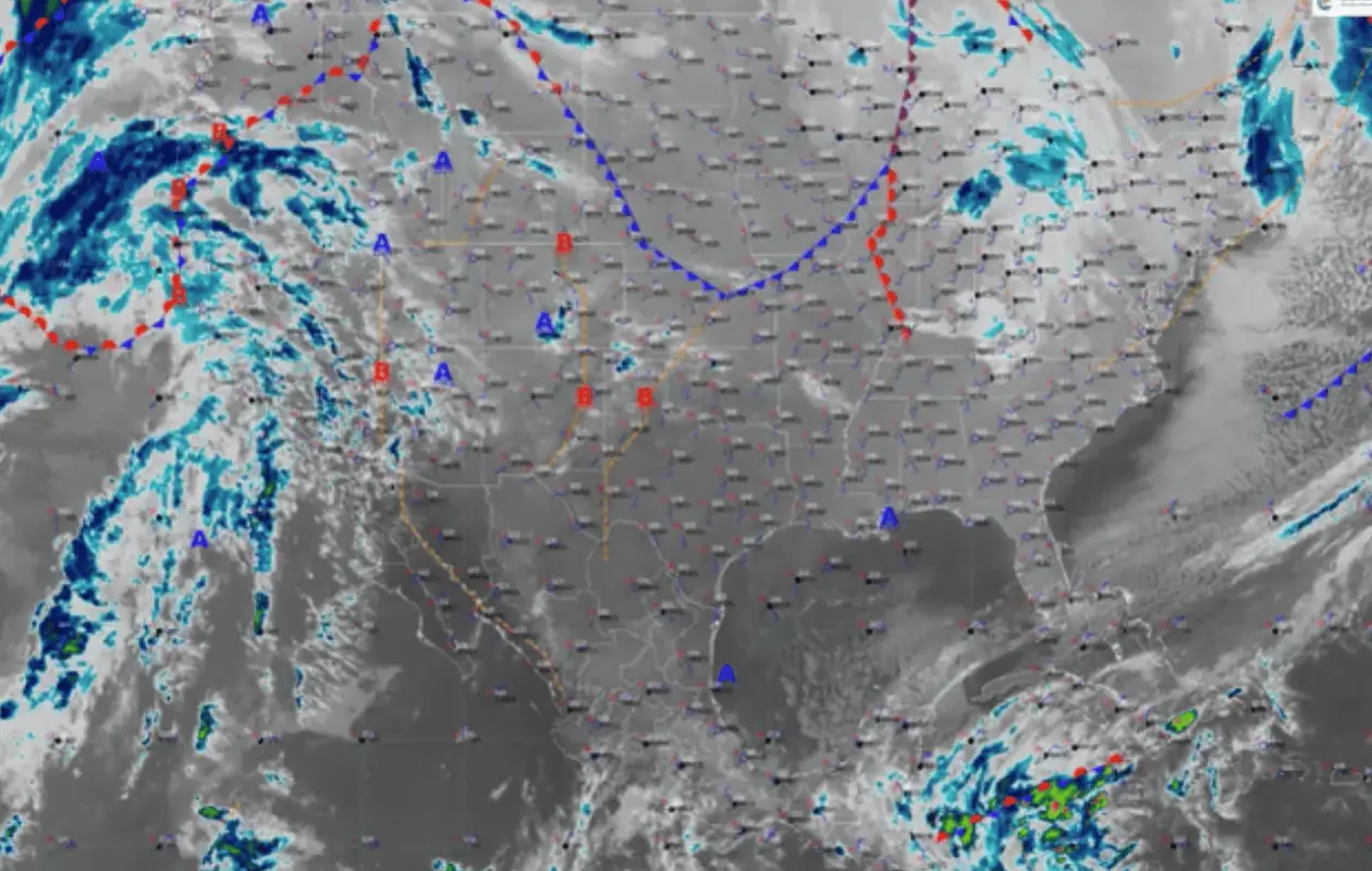 Por la noche del jueves, un nuevo frente frío se aproximará al noroeste de México, asociado con una vaguada polar y las corrientes en chorro polar y subtropical. Este sistema provocará: