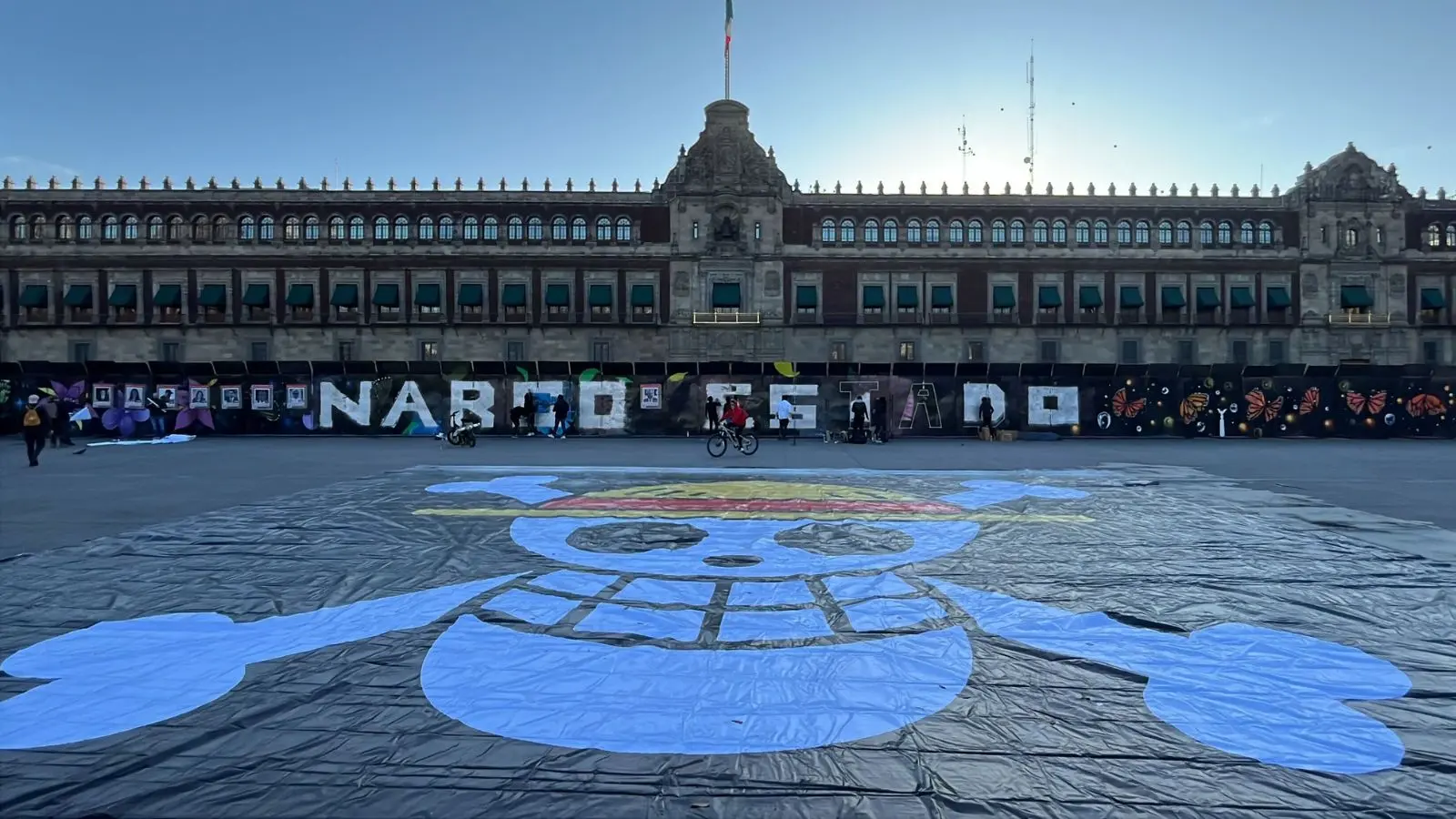 La enorme manta, colocada frente a Palacio Nacional, reproducía el símbolo pirata que se ha convertido en emblema de la Generación Z, acompañado del mensaje "Narcoestado".