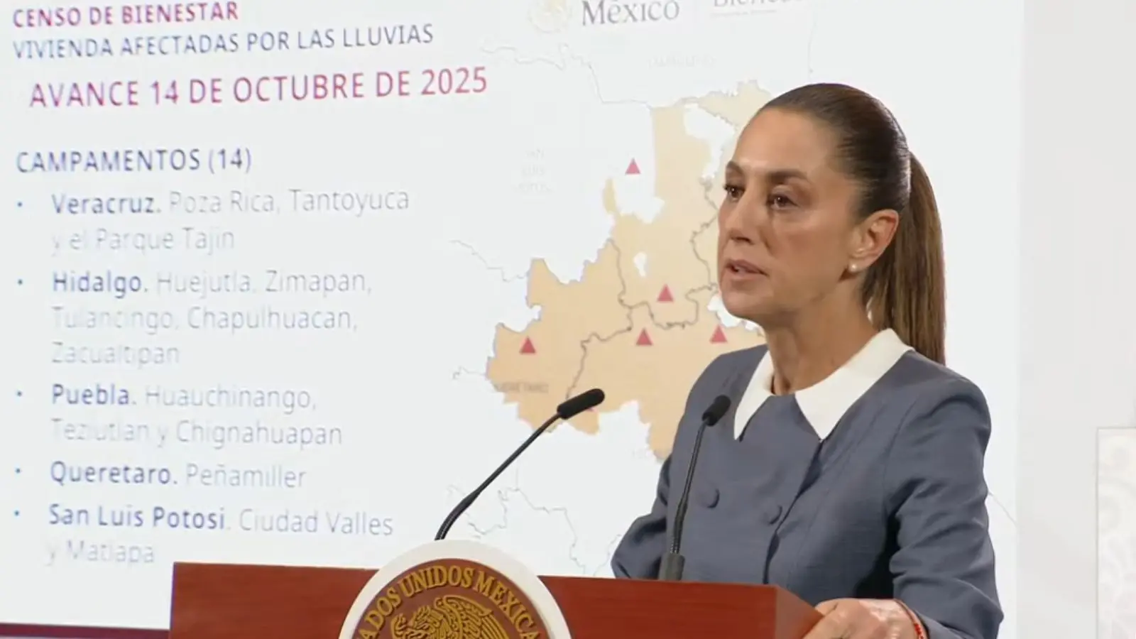 La presidenta de México, Claudia Sheinbaum Pardo, informó este martes que la cifra de personas fallecidas por las intensas lluvias registradas en los estados de Hidalgo, Puebla, Querétaro, San Luis Potosí y Veracruz ascendió a 65, luego de confirmarse una muerte más en Hidalgo.