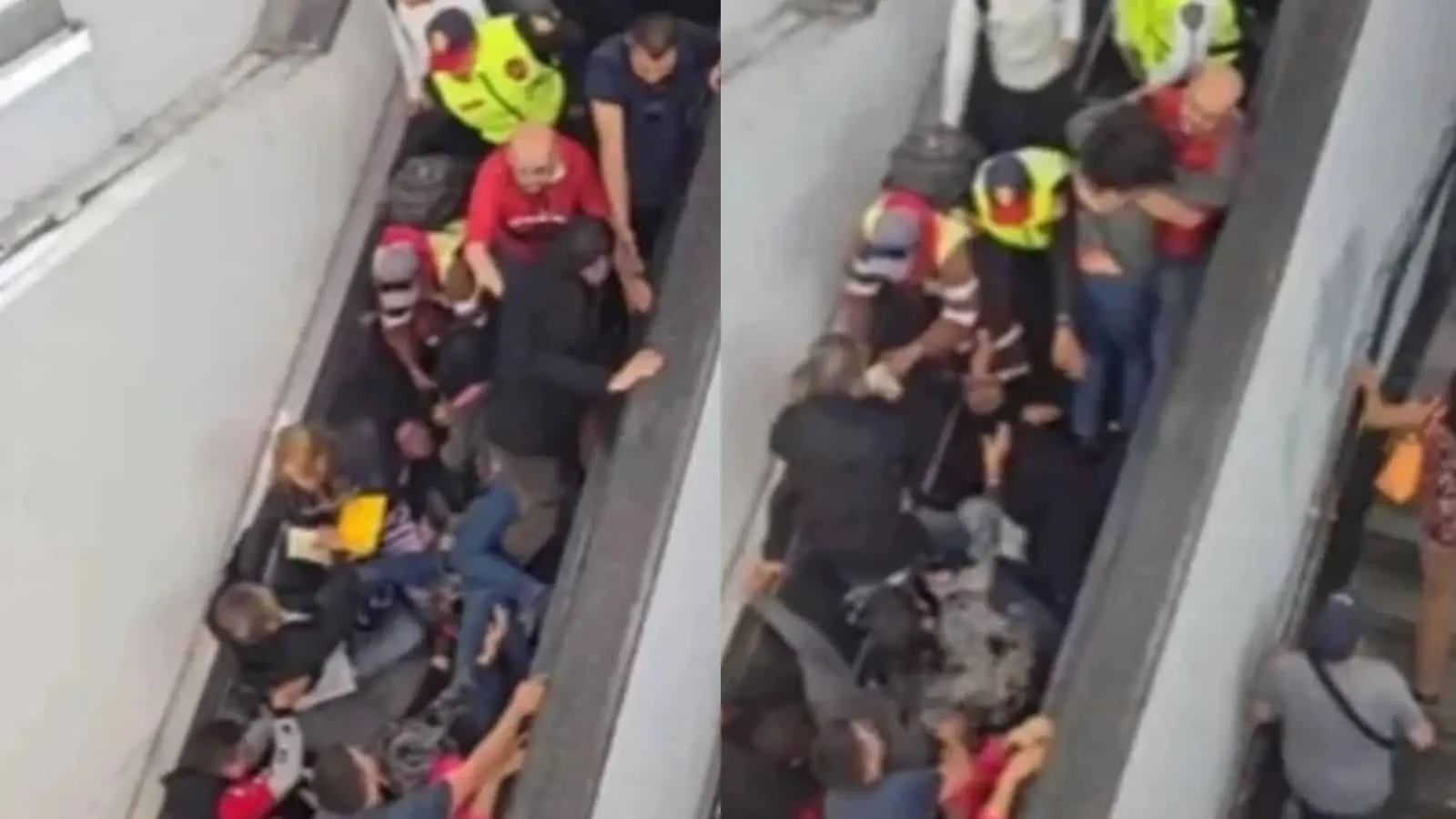 En segundos, la escalera eléctrica se convirtió en un punto de riesgo donde varios pasajeros cayeron uno sobre otro, sin posibilidad de sostenerse o frenar la caída.