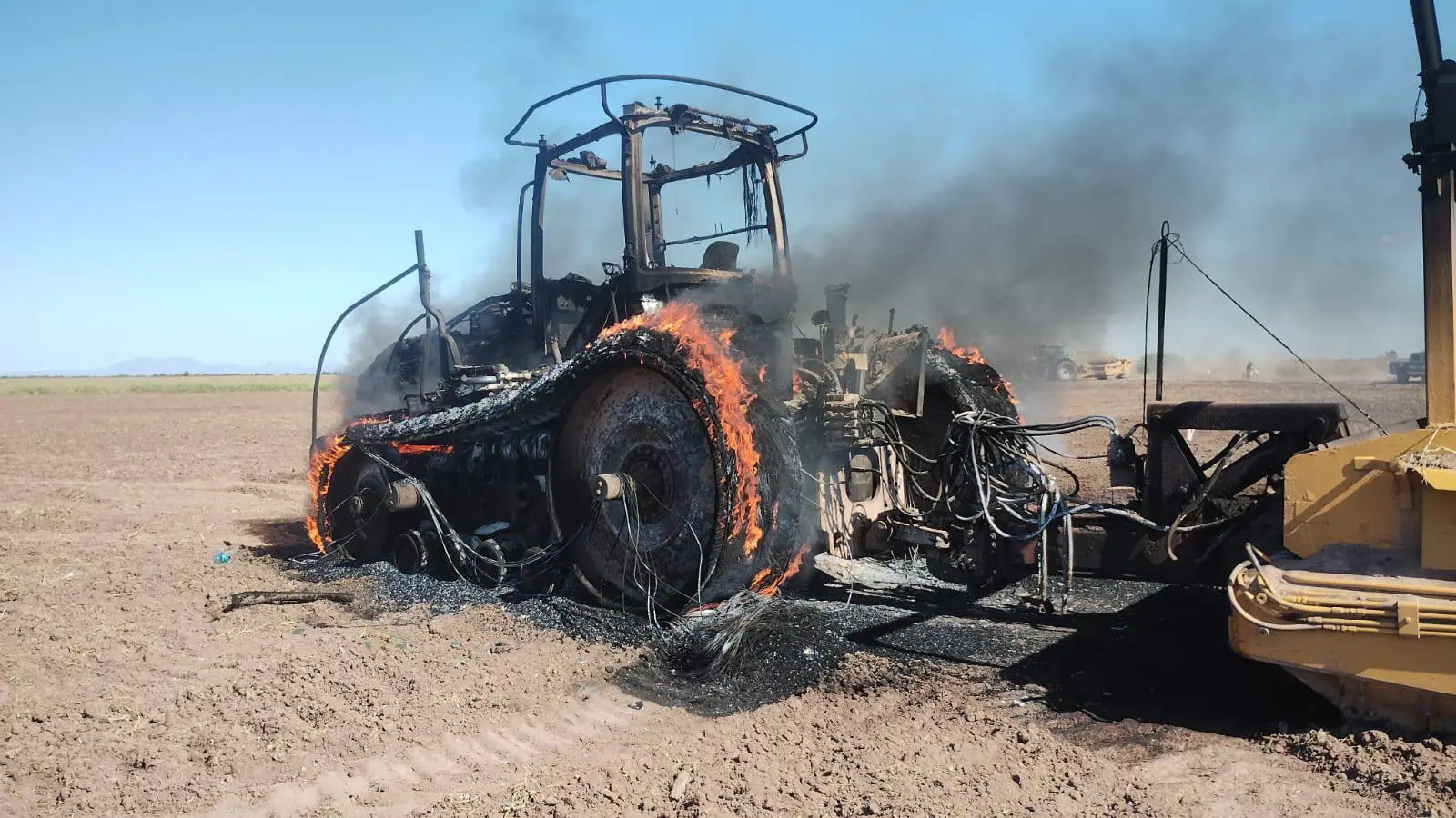 Mientras realizaba trabajos en un predio agrícola del Valle del Yaqui, un tractor fue arrasado por voraz incendio, movilizando a autoridades y cuerpos de emergencias.