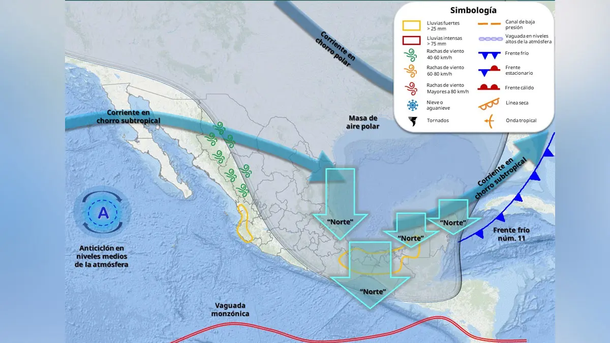 De acuerdo con el pronóstico, la masa de aire polar asociada al frente frío 11 permanecerá sobre el noreste de la entidad, interactuando con la corriente en chorro subtropical, lo que podría generar vientos moderados con posibles tolvaneras en las regiones mencionadas.