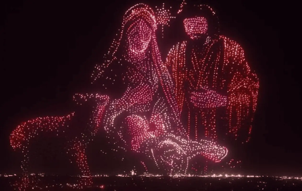 Miles de drones se elevaron de manera sincronizada para formar las figuras del Niño Jesús, la Virgen María y San José, acompañadas por la estrella de Belén y un pequeño becerro. Gracias a una detallada coreografía aérea, las imágenes no solo tomaron forma en el cielo, sino que parecían moverse e interactuar entre sí.
