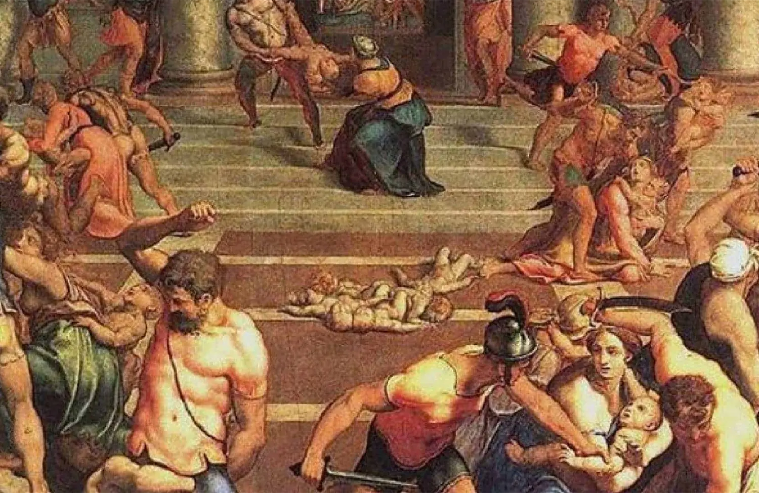 Según el Evangelio de Mateo, en el Nuevo Testamento, el rey Herodes I el Grande, gobernante de Judea bajo el Imperio romano, ordenó la ejecución de todos los niños menores de dos años en Belén y sus alrededores. La decisión habría sido motivada por el temor de Herodes a perder su poder tras escuchar la profecía sobre el nacimiento del llamado "rey de los judíos", en referencia a Jesús.