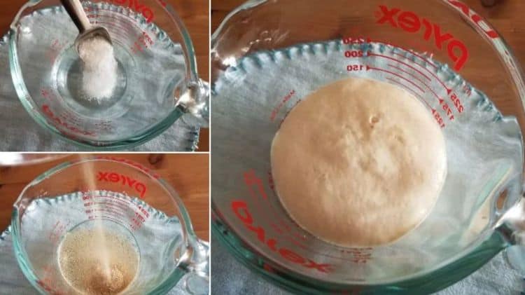 - Para iniciar con la masa, en un recipiente pequeño coloca un cuarto de taza de agua tibia, añade una cucharadita de azúcar junto con la levadura y mezcla suavemente. Cubre y deja reposar alrededor de cinco minutos, hasta que la mezcla forme una espuma, señal de que la levadura está activa.